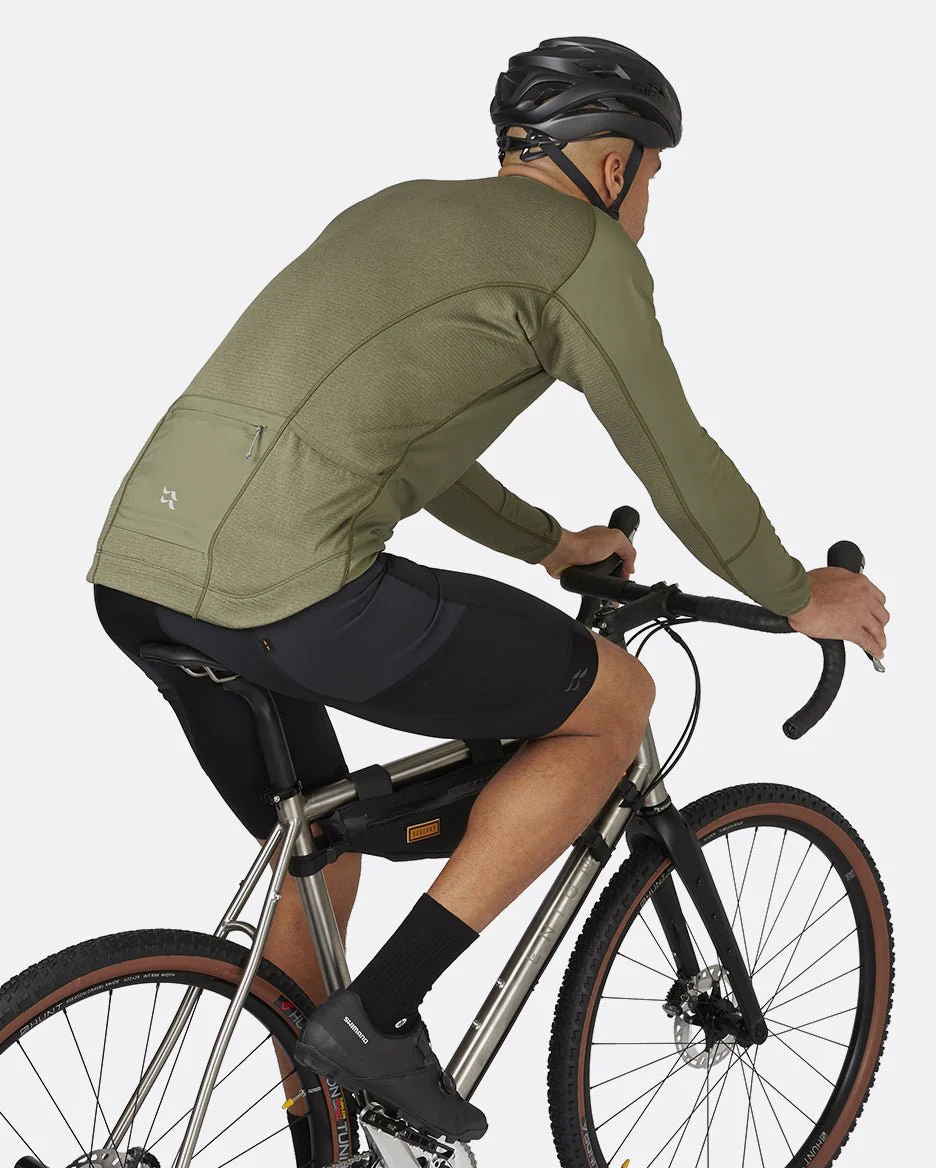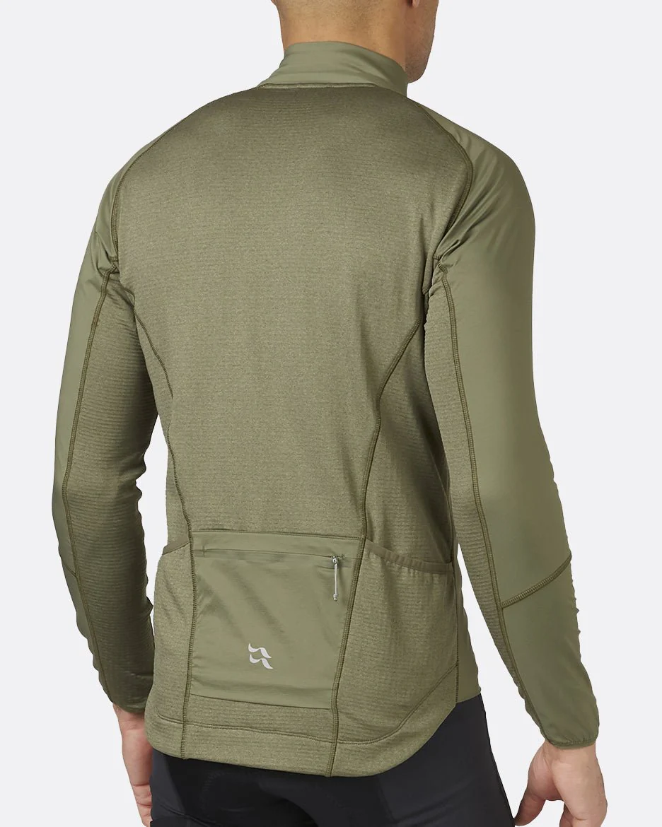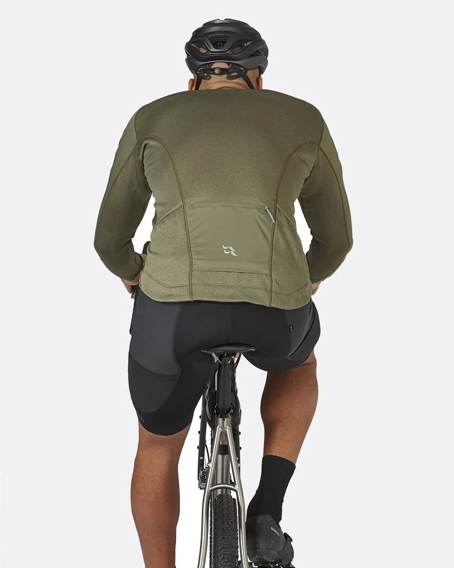 Diseñado específicamente para el sillín, tiene un dobladillo trasero caído que cubre las caderas, con una empuñadura de silicona para mantenerlo en su lugar. Los ribetes elásticos en los puños ayudan a sellar las corrientes de aire no deseadas, mientras que la cremallera de largo completo con protector de cremallera resistente al viento puede proporcionar ventilación adicional cuando estás inyectando energía en la escalada. Un bolsillo trasero resistente a la humedad con cremallera y dos bolsillos ocultos abiertos son fácilmente accesibles sin necesidad de detenerse.