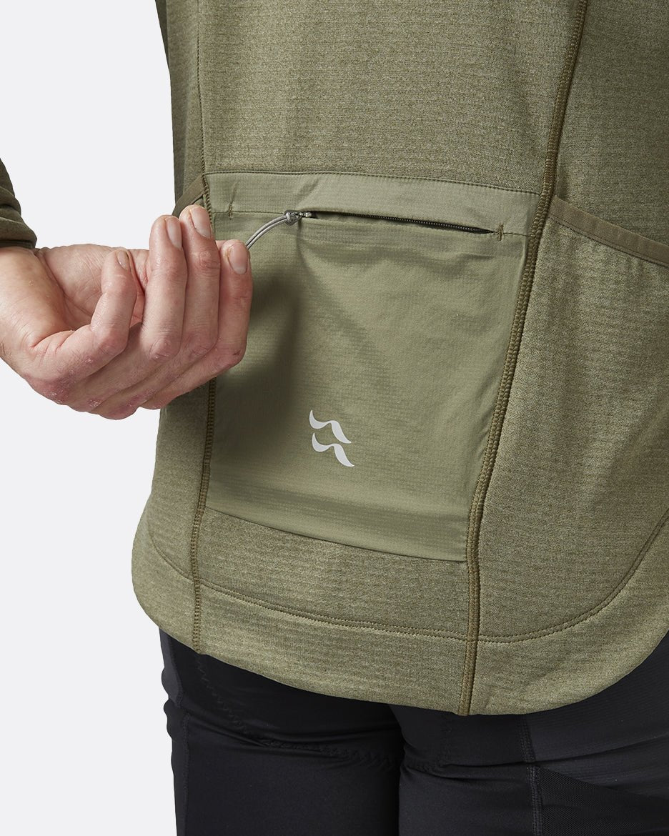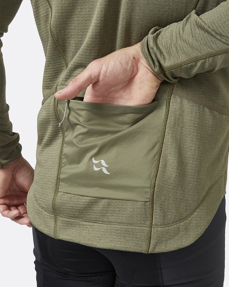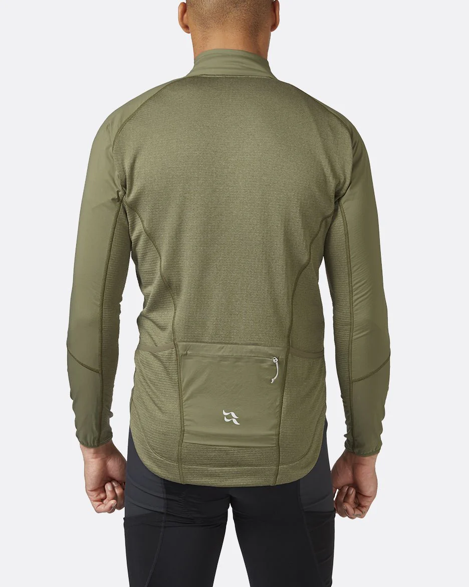Diseñado específicamente para el sillín, tiene un dobladillo trasero caído que cubre las caderas, con una empuñadura de silicona para mantenerlo en su lugar. Los ribetes elásticos en los puños ayudan a sellar las corrientes de aire no deseadas, mientras que la cremallera de largo completo con protector de cremallera resistente al viento puede proporcionar ventilación adicional cuando estás inyectando energía en la escalada. Un bolsillo trasero resistente a la humedad con cremallera y dos bolsillos ocultos abiertos son fácilmente accesibles sin necesidad de detenerse.