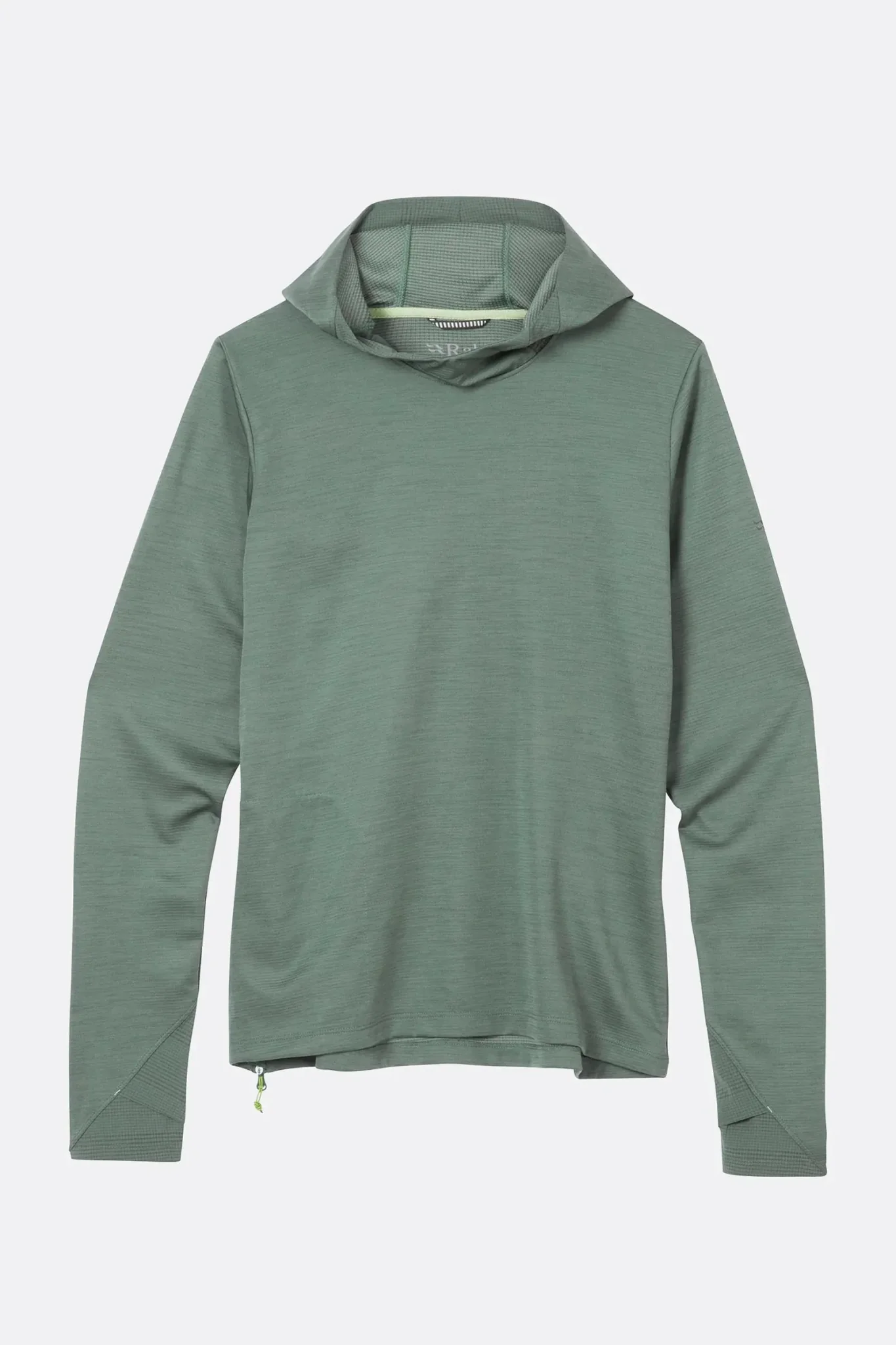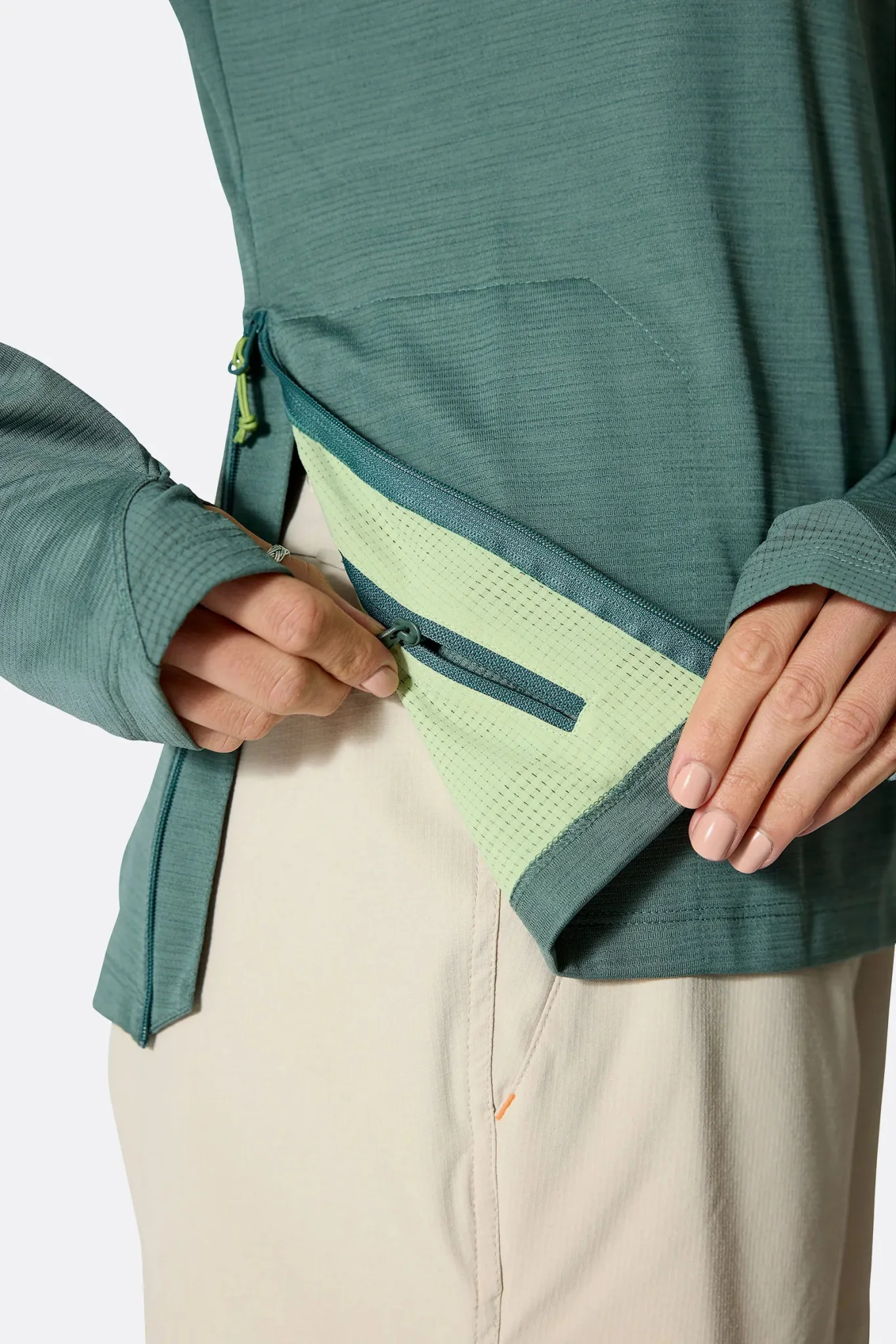 - Las trabillas para los pulgares en los puños evitan que las mangas se amontonen cuando tienes los brazos por encima de la cabeza.